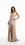 Vestido satinado tono champaña con escote drapeado, tirantes delgados y cintura marcada. Falda larga con abertura alta lateral y caída elegante al piso.