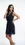 Vestido mini azul marino de chifón con escote cruzado en V, cintura marcada y hombros con pedrería, ideal para cocteles y bodas de tarde.