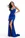 Vestido de lentejuela brillosa, azul con plumas en parte superior strapless, con escote en pierna izquierda.