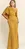 Vestido largo mostaza asimétrico con manga capa y drapeado, elegante y moderno.