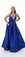 Vestido azul rey de cuello halter con falda asimétrica en cascada, ideal para un look elegante y moderno.