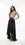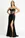 Vestido maxi negro con lentejuelas, escote recto y tirantes con moño. Entallado con abertura alta para un look de noche glam e impactante.