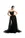 Vestido sirena strapless negro con diseño dorado tipo Art Deco y brillo. Bustier estructurado que estiliza y caída maxi al piso para un look de gala.